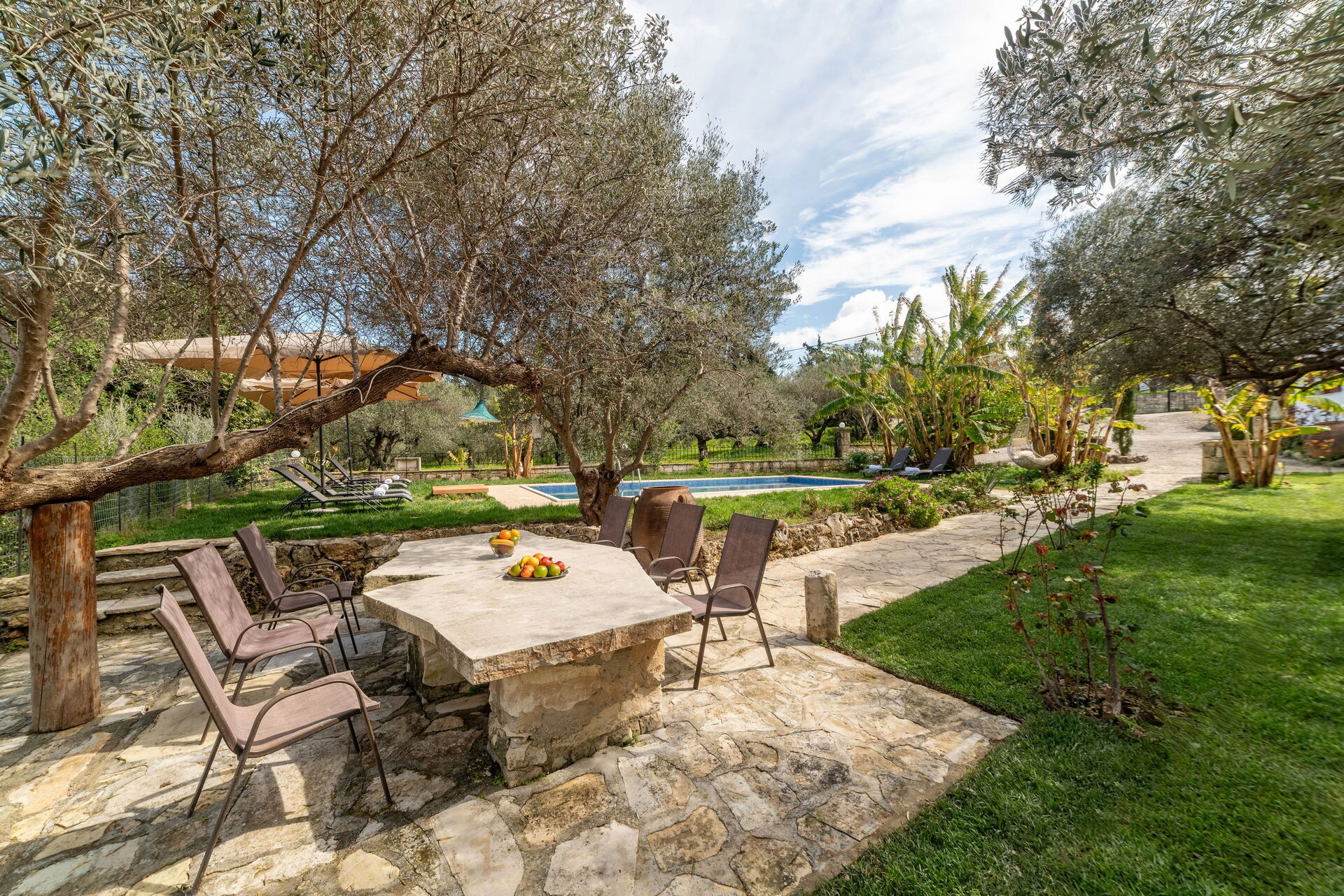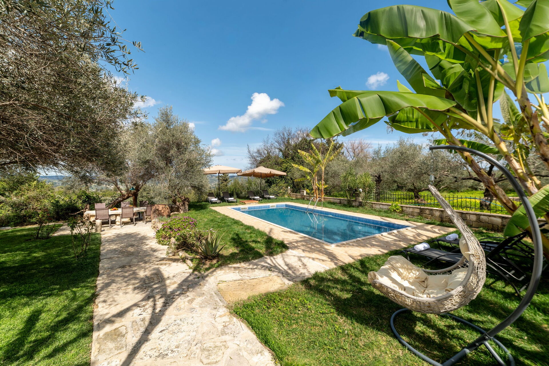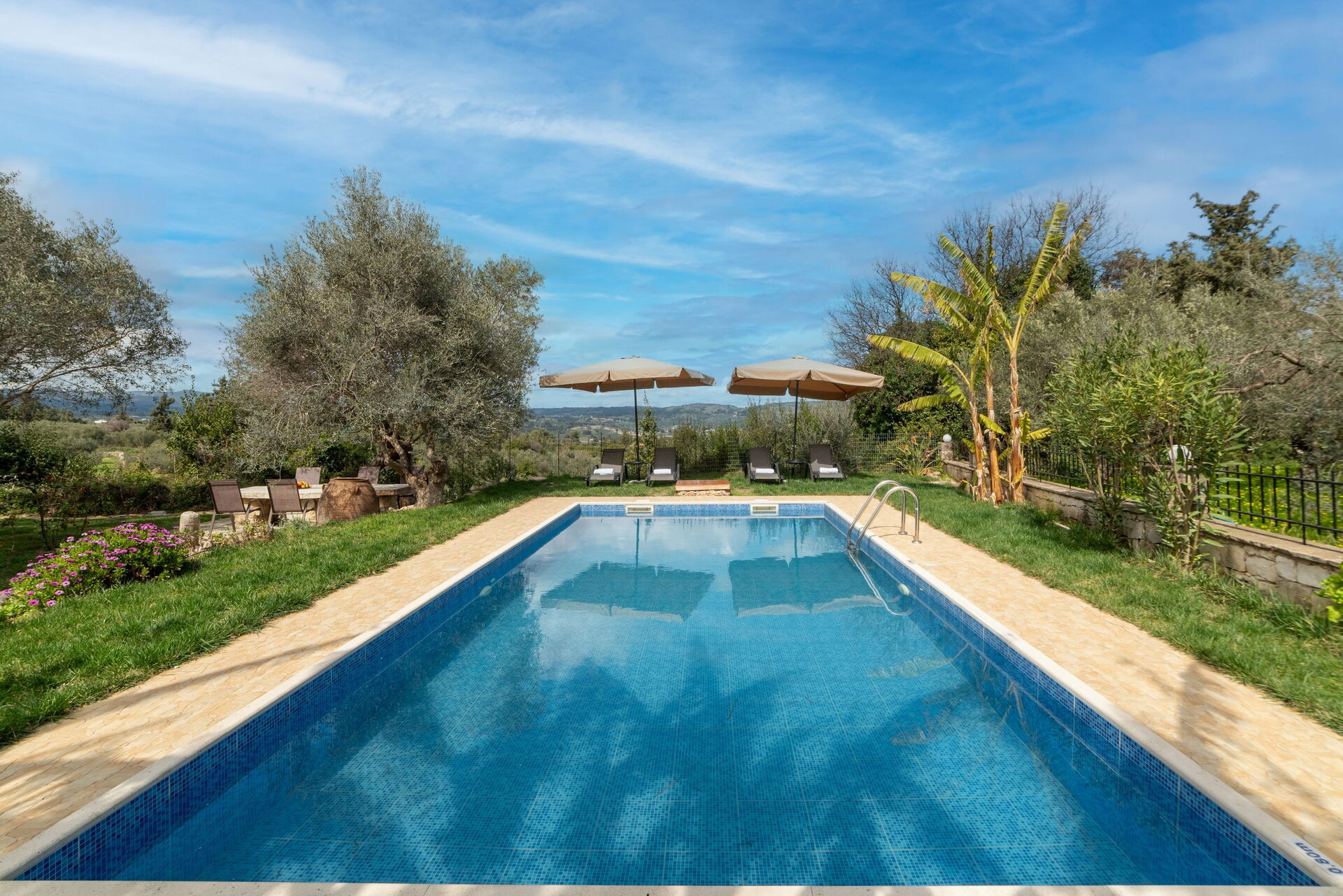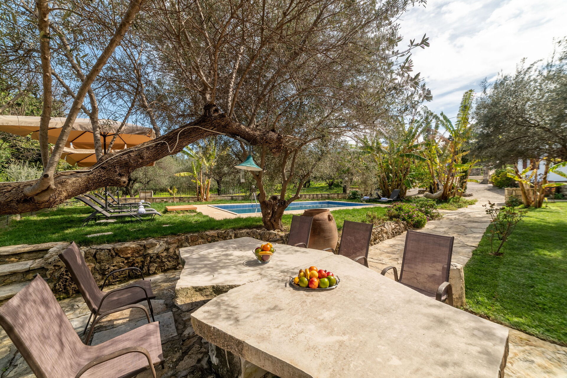 Sehr schönes Haus mit extrem schönem Garten und Pflanzen. Eigenes Ernten von z.B. Bananen und Weintrauben möglich. Ausreichend großer Pool. Im Garten kann man sowohl sonnige als auch schattige Plätzchen unter Olivenbäumen finden.
