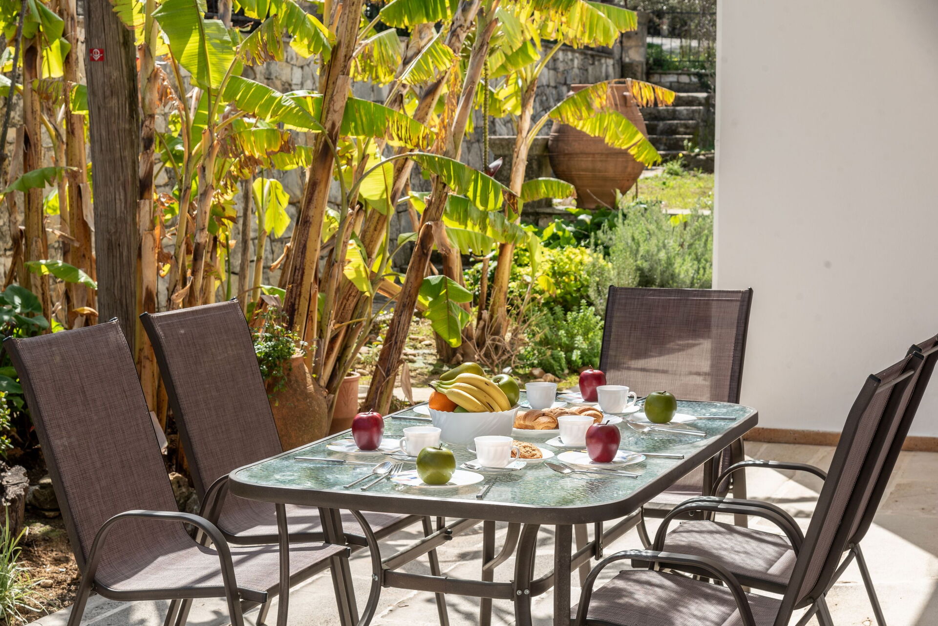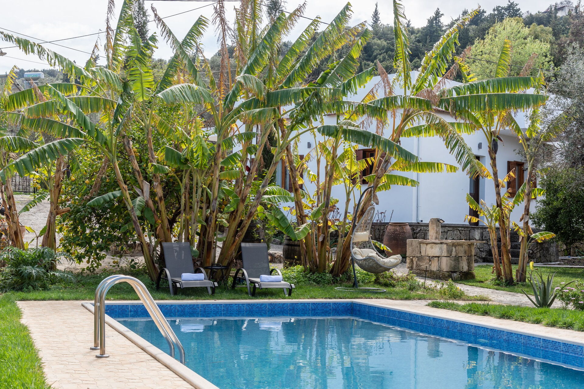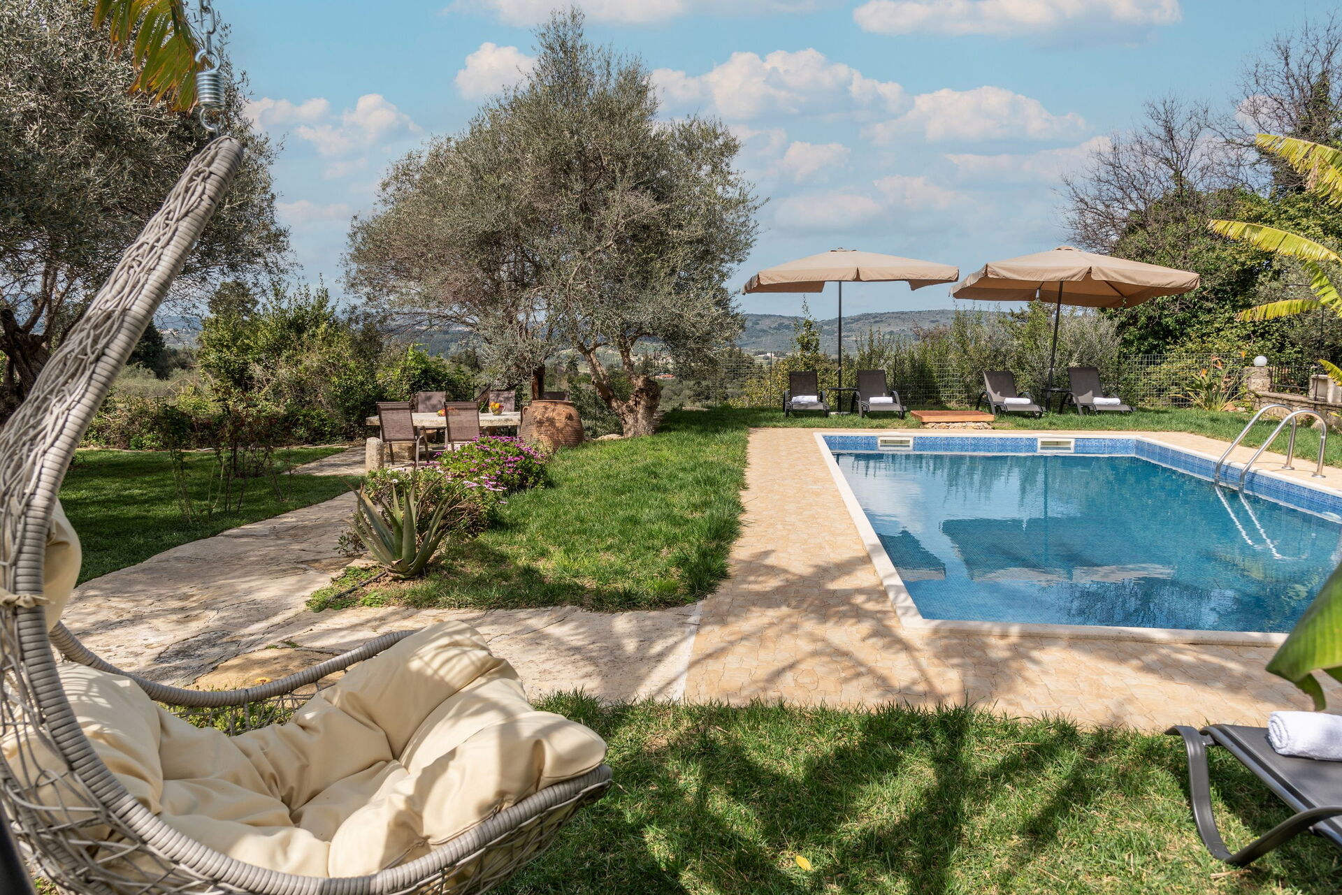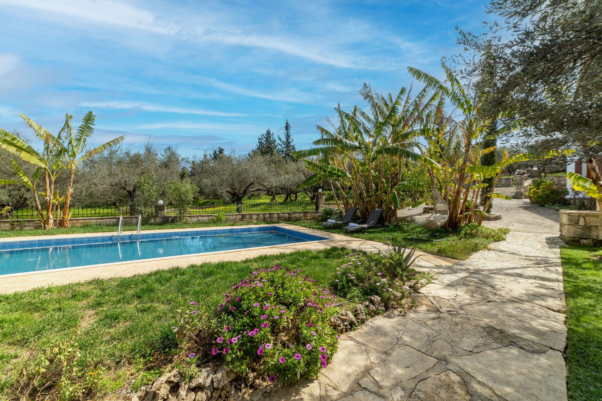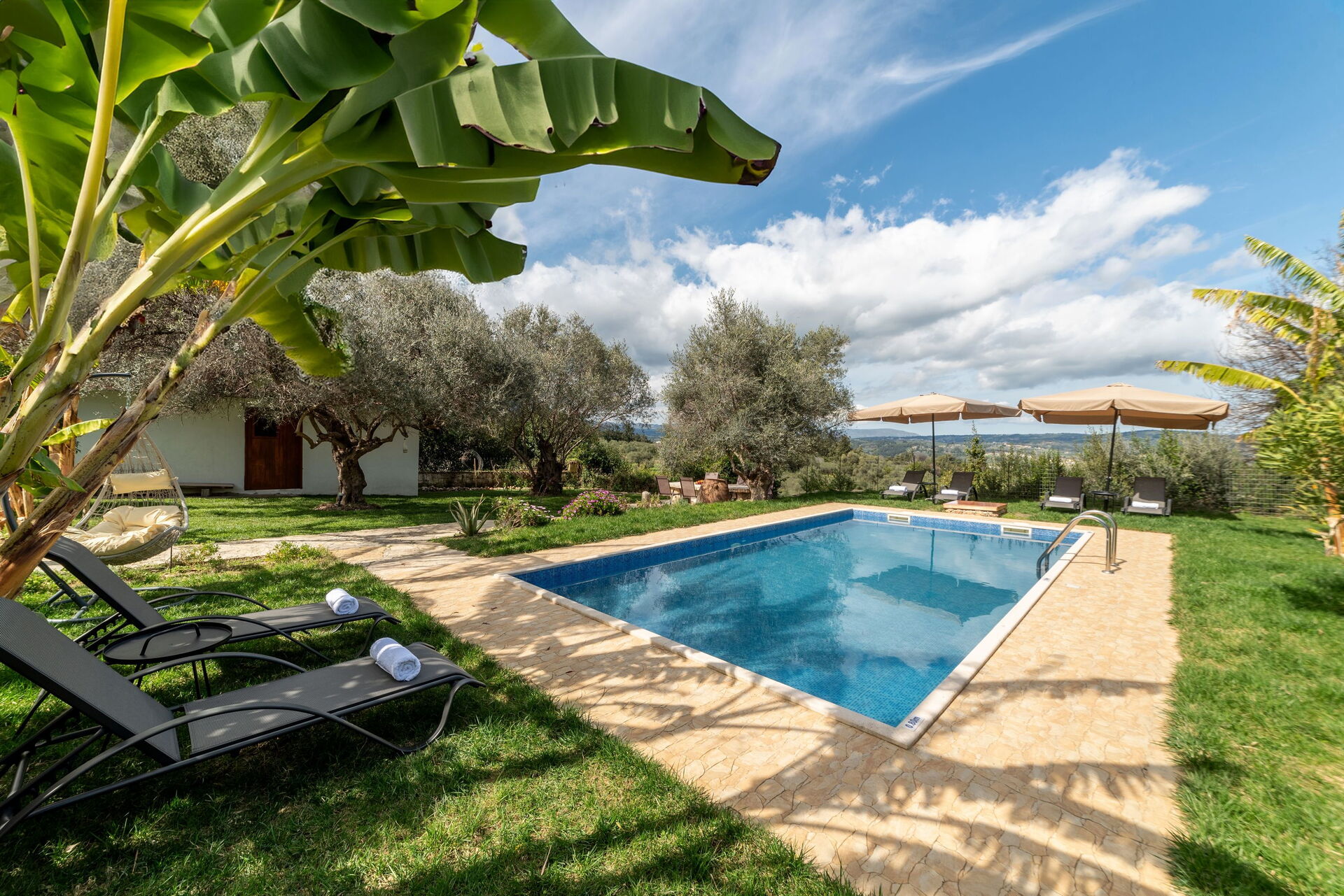 Sehr schönes Haus mit extrem schönem Garten und Pflanzen. Eigenes Ernten von z.B. Bananen und Weintrauben möglich. Ausreichend großer Pool. Im Garten kann man sowohl sonnige als auch schattige Plätzchen unter Olivenbäumen finden.