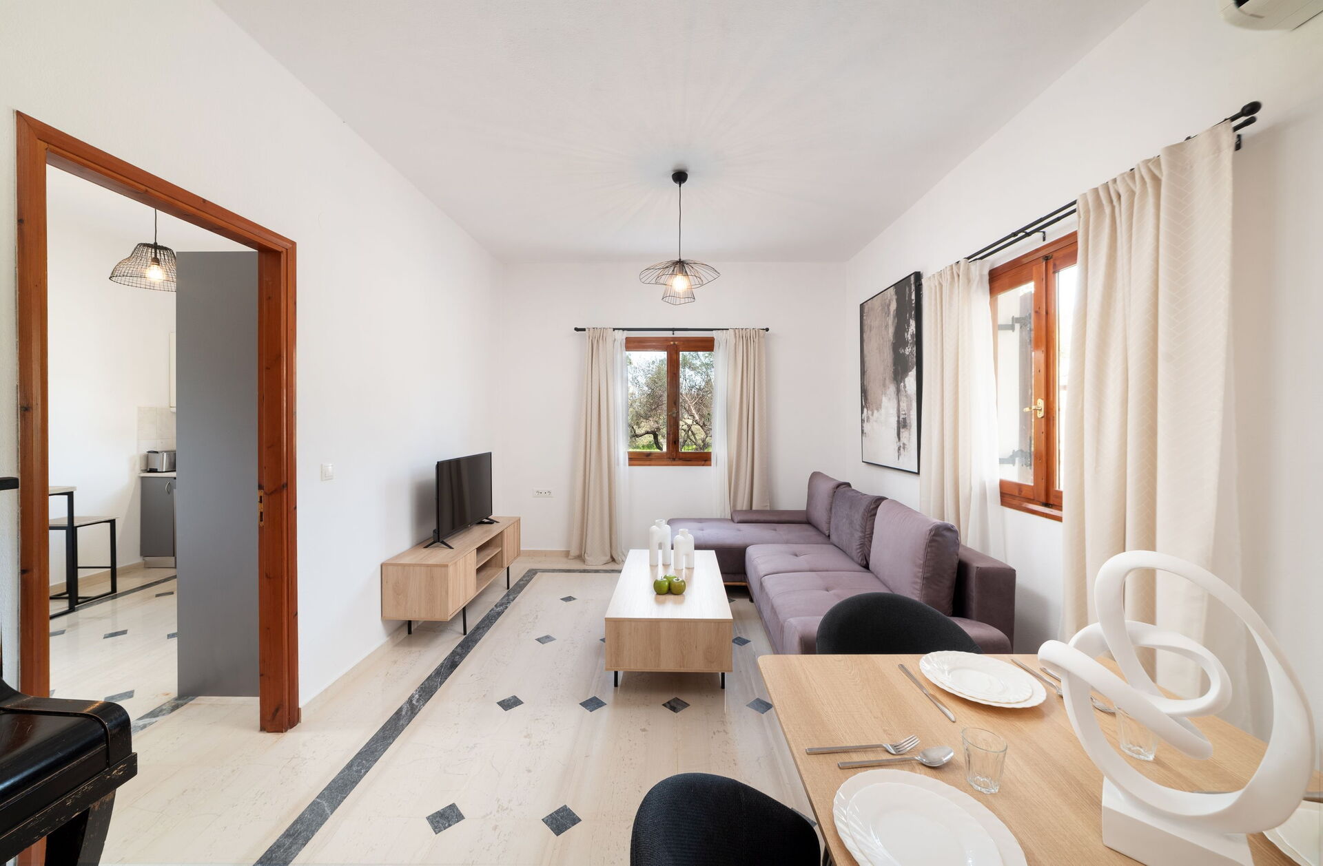 Distanze: Vrisses (negozi di ogni genere) a 2,5 km, Vamos a 8 km, Georgioupoli (negozi di ogni genere e spiagge) a 8 km, Almyrida a 14 km, Rethymno a 35 km, Chania a 38 km, aeroporto a 42 km, il famoso Palazzo di Cnosso a 110 km, Heraklion a 111 km.