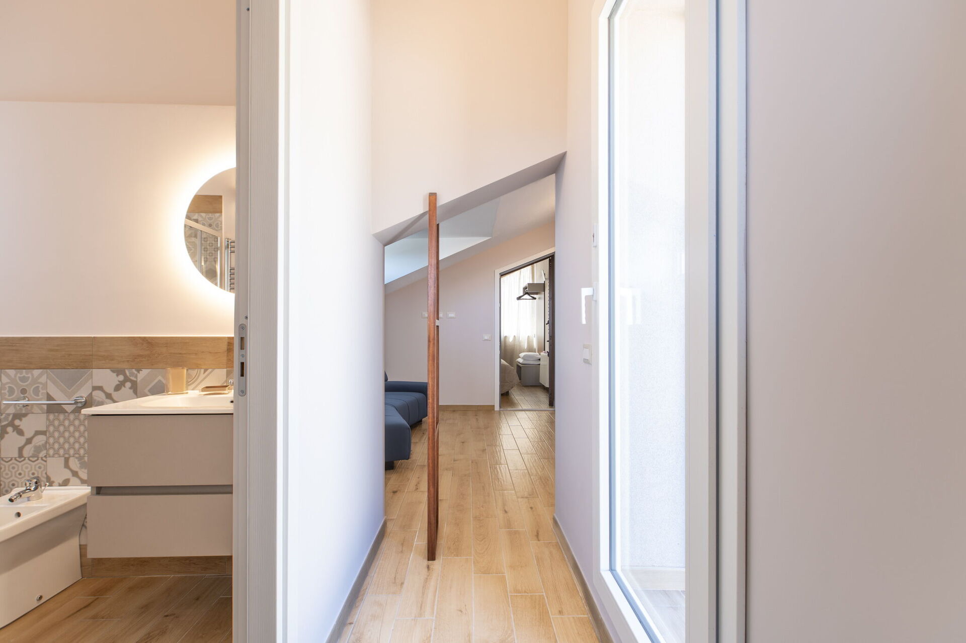 Primo piano: soggiorno con accesso su terrazza-solarium (smart tv), 2 camere matrimoniali, bagno con doccia. Il soggiorno e una delle camere hanno una parte di soffitto che va a scendere.
