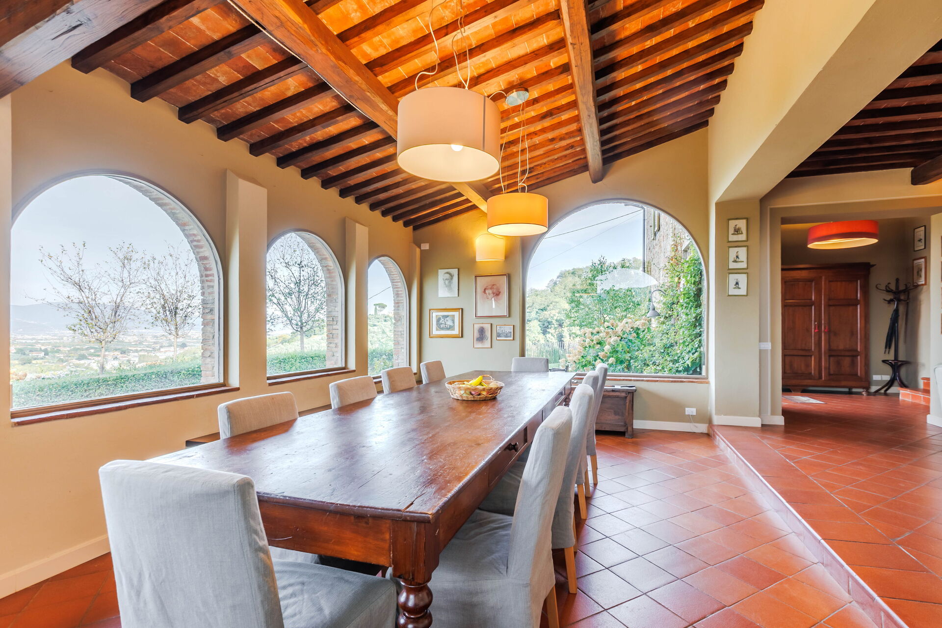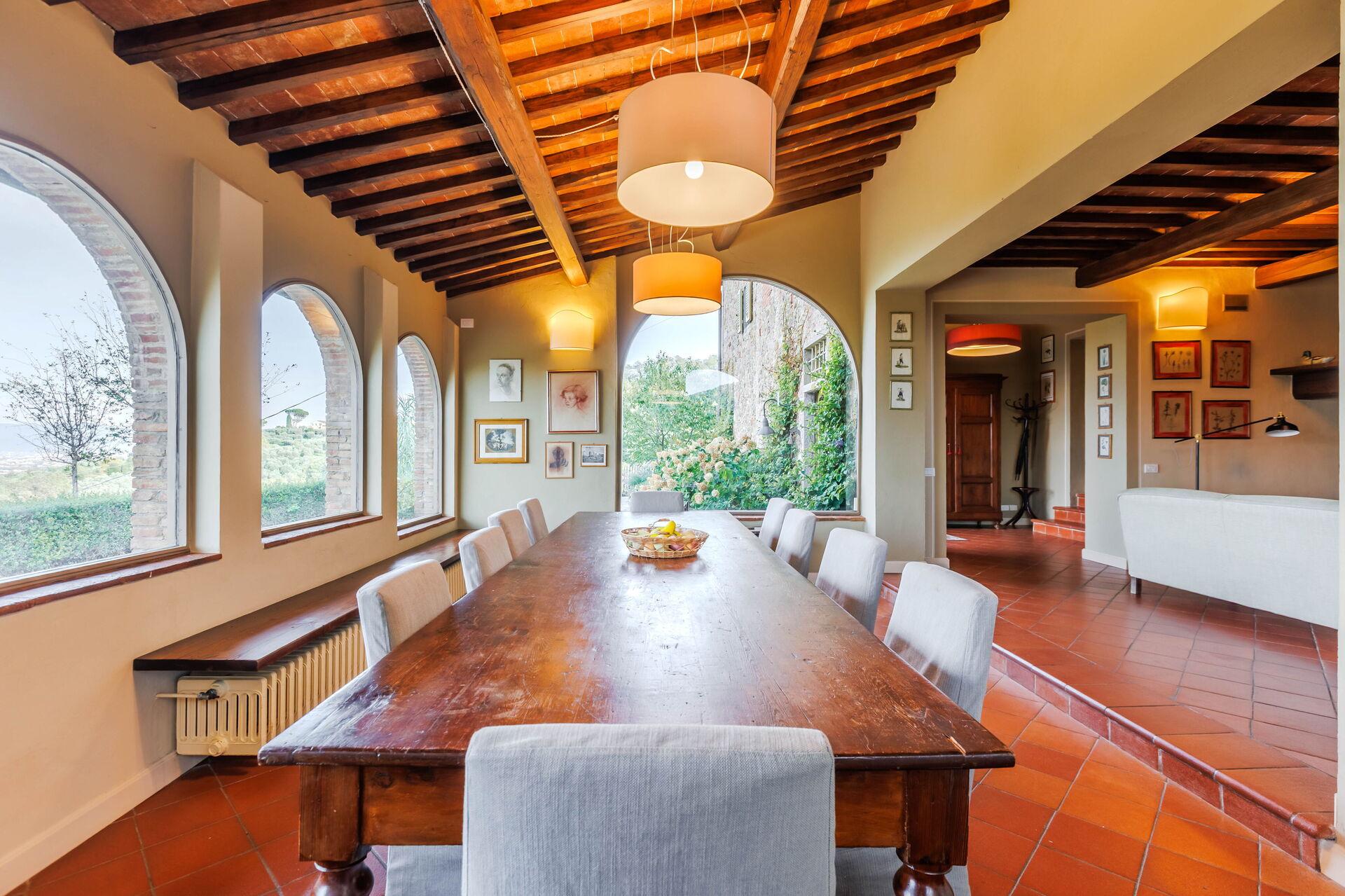 The villa's surroundings are a symphony of beauty and serenity. The meticulously landscaped gardens are a visual delight, with vibrant blooms and fragrant herbs. The outdoor areas are equally impressive, featuring a luxurious pool that beckons you for a refreshing swim while soaking in panoramic views of the Tuscan countryside.