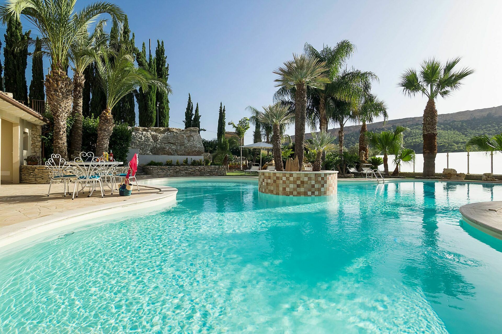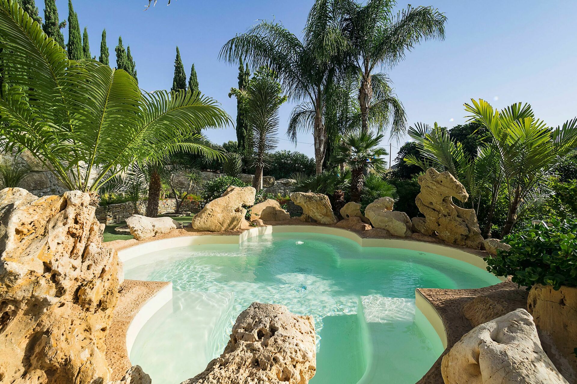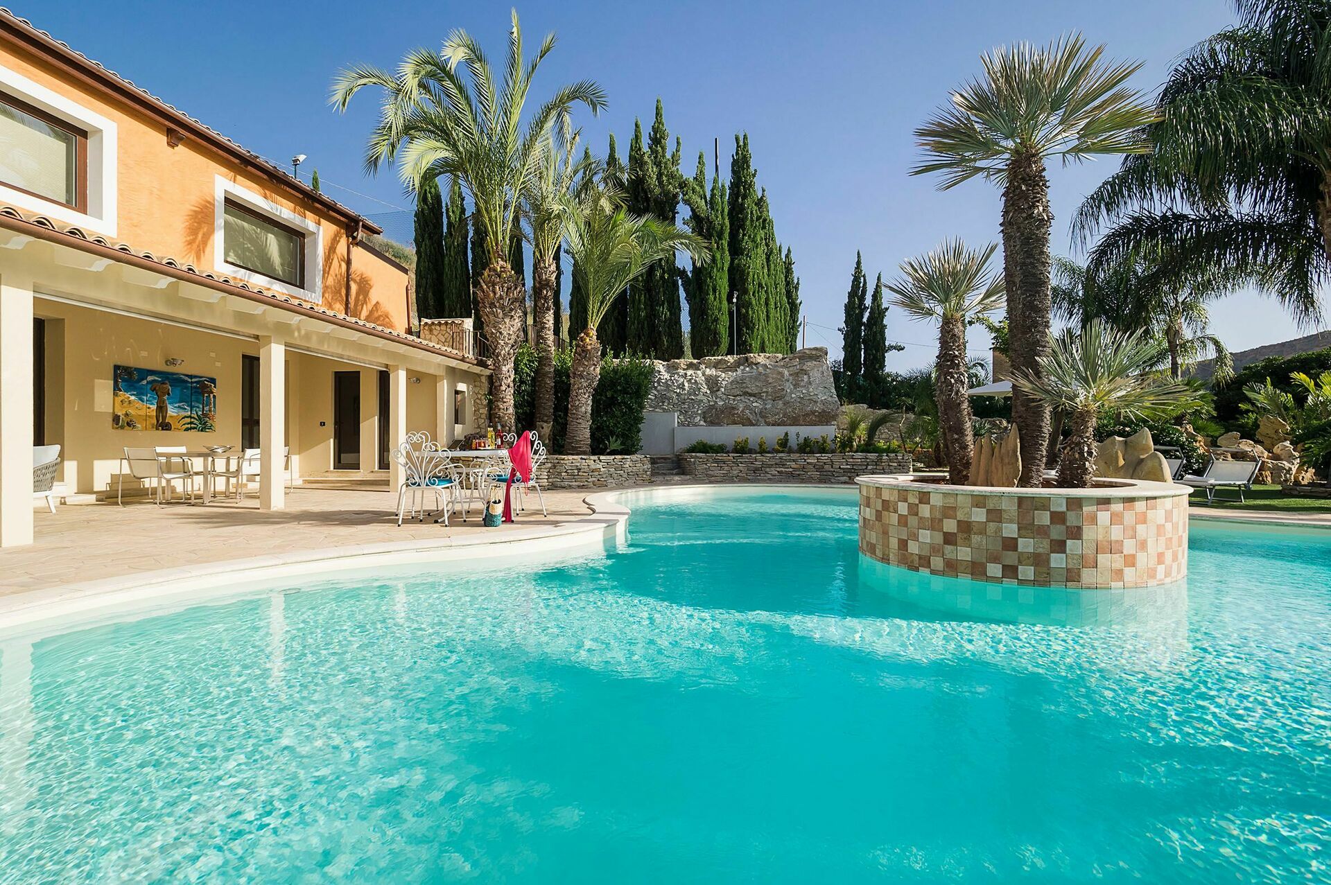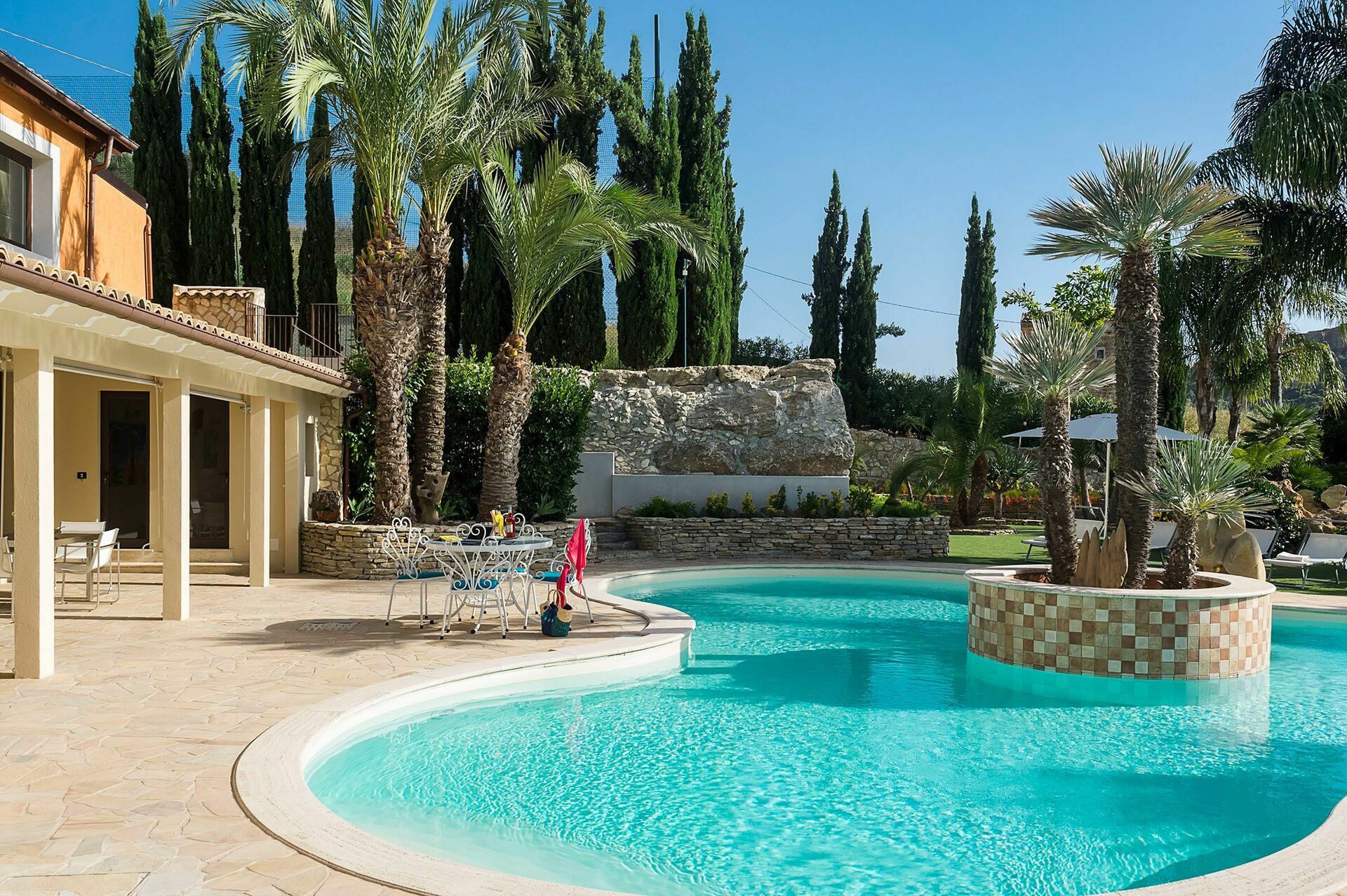 Just a few kilometres from this villa with private pool guests will find the Temples' Valley, sandy beaches and the city of Agrigento. The villa is surrounded by a green private garden with a swimming pool, which is in the shape of a clover and a fabulous jacuzzi is set in the rocks. The garden has a furnished patio, perfect to have al-fresco dinings. The property is organized in 2 different units: a main house and a dependance. This villa has several relax and fun areas as a soccer field and a game room with a ping-pong table, table football and billiards.